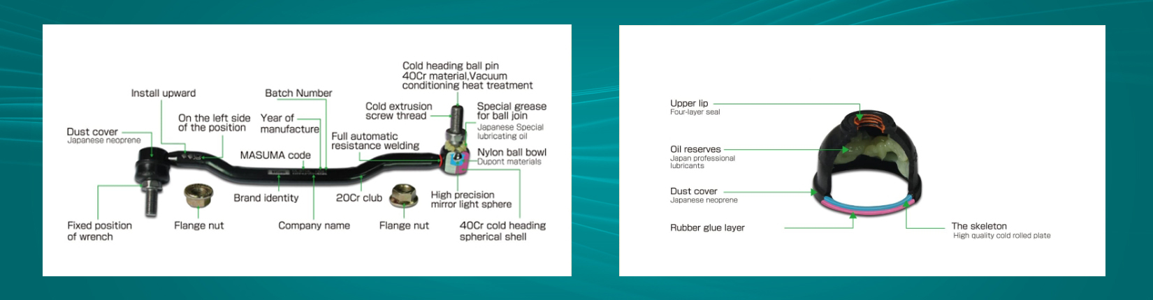 TOMOI suspension ball head/external rod ball head series products Ball jacket adopts 40Cr fine forging standardized and hardened, 100% defect detection and then precision machining. The balance ball head series adopts Japanese high-precision automatic welding equipment, the welding angle is accurate, the impact strength and tensile force exceed 2000 kg.F, The ball casing material adopt slow carbon steel cold treatment process, unique forming, surface phosphate blackening, salt spray test for more than 72 hours. The ball stud is made of 40Cr material, the ball jacket is made of a Japanese special material, the ball head lubricant is made of Japanese special grease, the dust cover is made of Japanese Denka neoprene, the low temperature resistance reaches -45 degrees centigrade and the high temperature resistance reaches 120 degrees centigrade. Outstanding toughness and abrasion resistance.