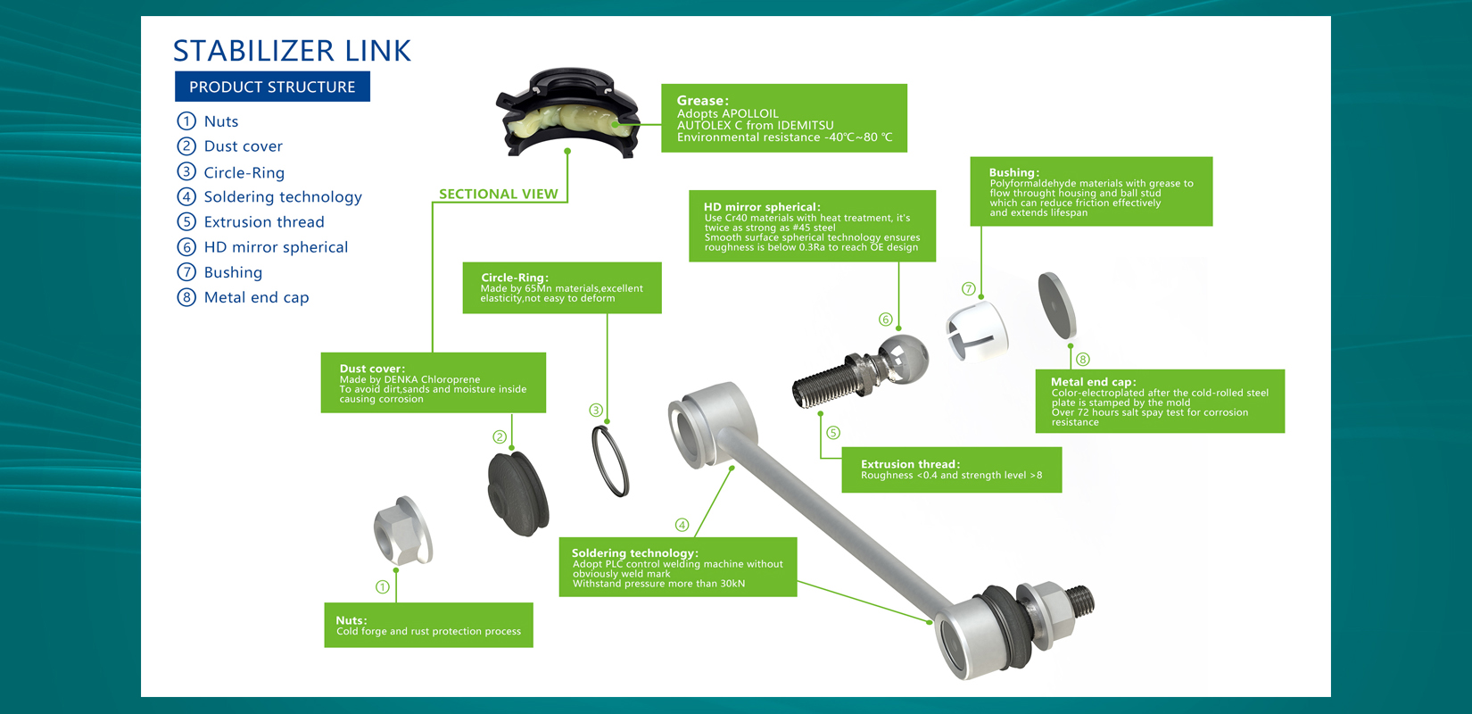 TOMOI stabilizer links are manufactured with superior materials, innovative design, advanced equipment and high-end technology from Japan and Korea. TOMOI has passed the SGS-certified automotive industry quality management system lATF16949, strict performance tests (high and low temperature rotation resistance, mud spray and rubber dust protection test at high and low temperature, etc.) to ensure excellent and stable performance and durability of each product.